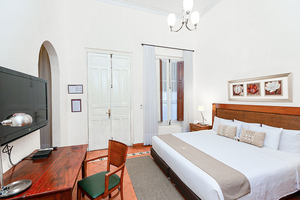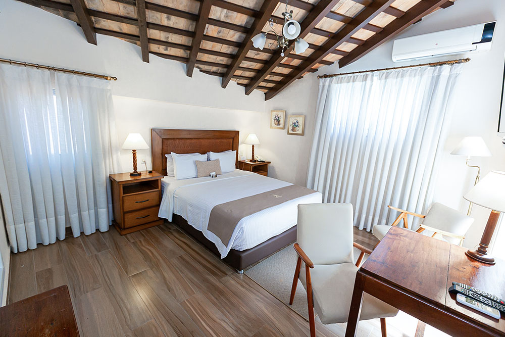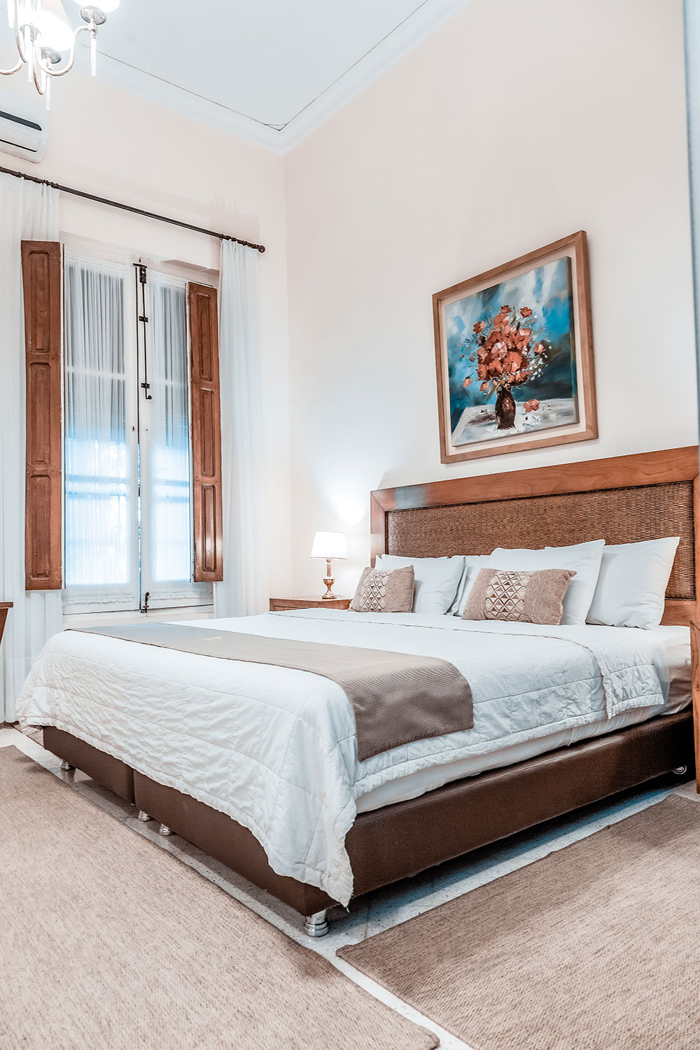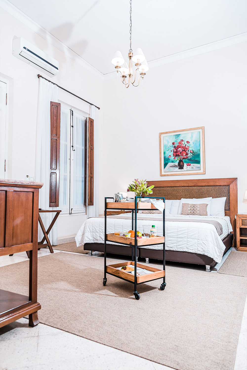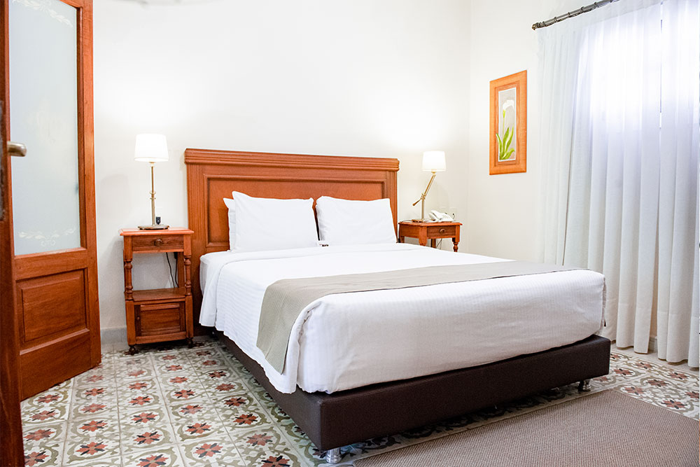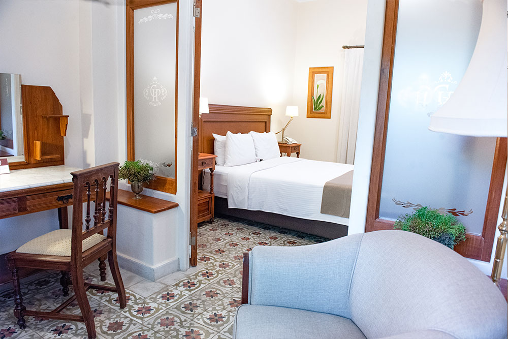 Nuestra mejor carta de presentación, para el más placentero descanso. Dos ambientes totalmente decorados con diseño de la época y con el máximo confort vanguardista. Con una Cama King Size, los corredores y jardines, abrazan la habitación llenos de historia, para que tu estancia sea inolvidable. Cada habitación cuenta con los amenities para que su estadía sea agradable y placentera.