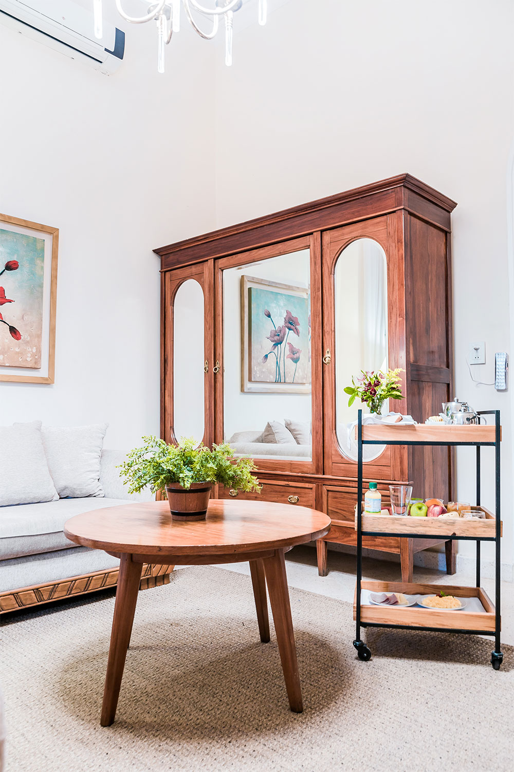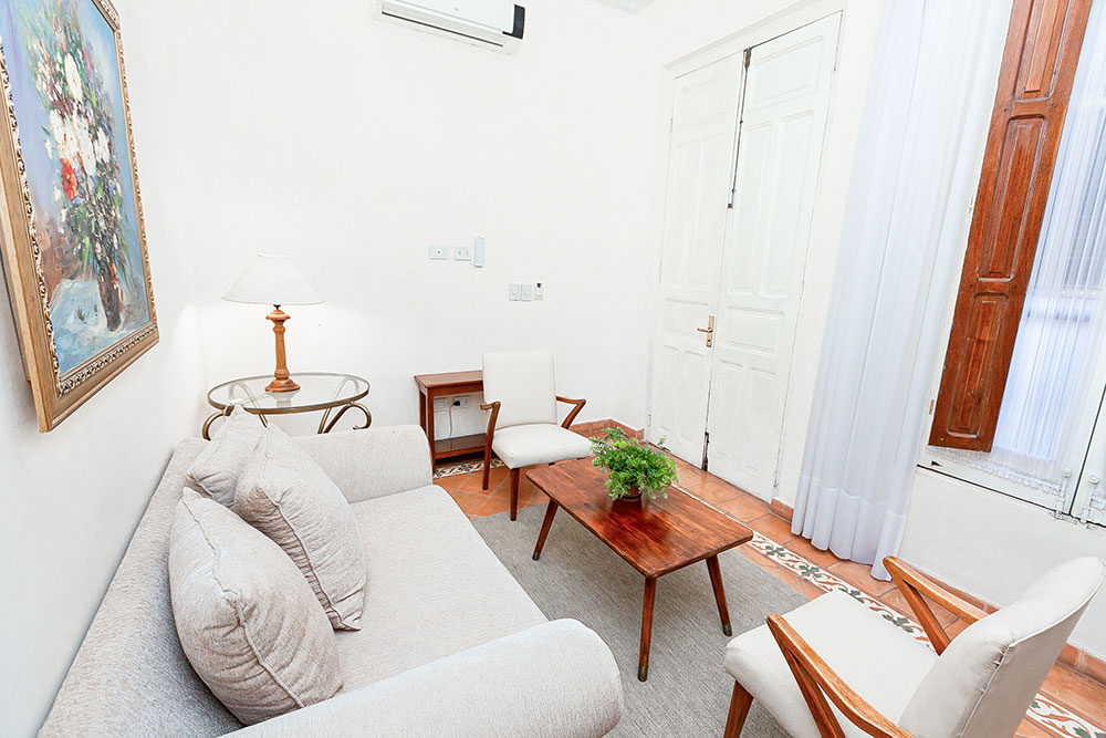 Situada en la planta baja del hotel, esta suite es amplia, luminosa, cuenta con un estar, un sofá cama, y una cama Queen Size. Con un pequeño patio interior y una vista a nuestro mágico jardín. Cada habitación cuenta con los amenities para que su estadia sea agradable y placentera.