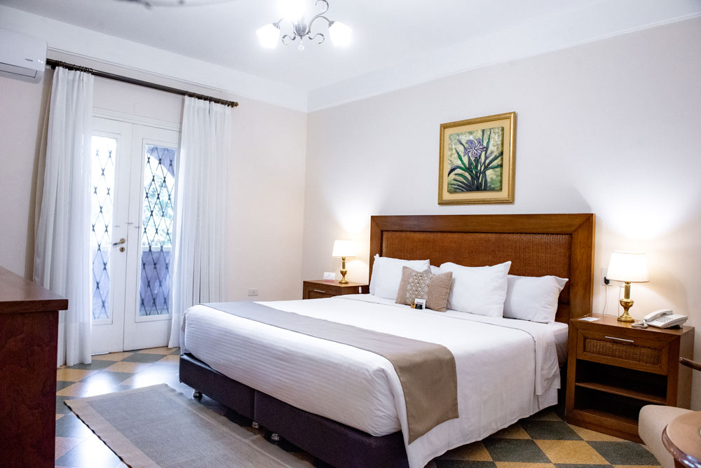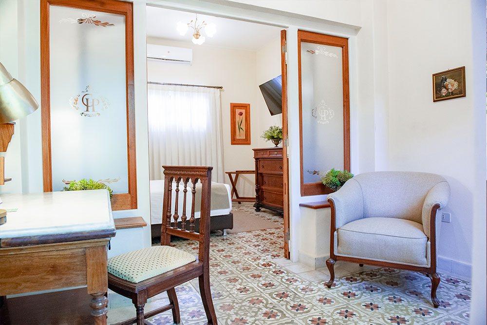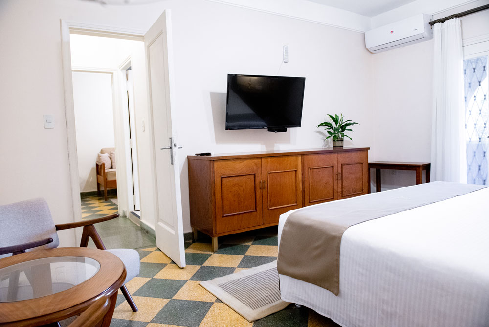 Esta suite ofrece dos ambientes súper espaciosos, luminosos, con una cama King Size, cuenta con una puerta comunicante a una habitación doble y se transforma en una familiar. En medio de corredores y jardines llenos de historia que nos transportan a inicios del 1900. Cada habitación cuenta con los amenities para que su estadia sea agradable y placentera.